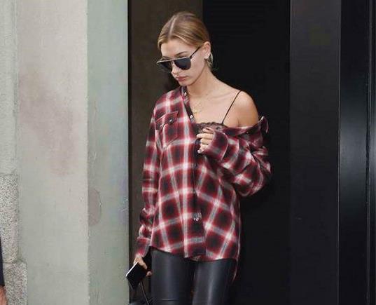 看看Hailey Baldwin穿着简单的复古格子衫,露出肩膀显得性感又强势,搭配皮裤微微露出一种霸气的感觉。