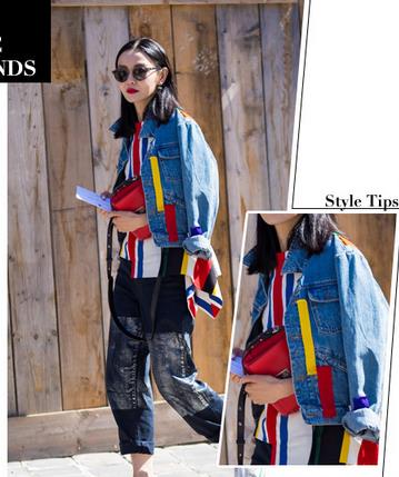 Look 1 >>>拼色装饰牛仔外套+彩色条恩山+宽松牛仔裤+白球鞋