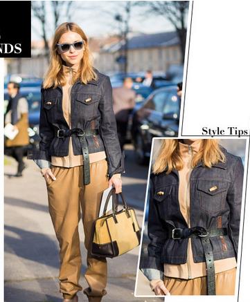 ▲搭配Tips:牛仔单品一样穿得出优雅高贵的感觉,深蓝色单宁外套搭配浅驼色夹克,扎上一条腰带干练显瘦,宽宽的萝卜裤和高跟鞋更是混搭出逼格!
