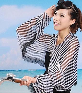 要去海边或出去游玩的妹子可以选择这款长袖条纹披肩,宽松薄纱的款式十分飘逸,穿着也舒服,里面可以是黑色背心家牛仔短裤,整体显得随性又时尚。