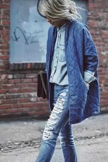 浅色牛仔衬衫,一般搭深色破洞牛仔裤比较好看。如果再搭浅色,在现在这个温度下,会显得有点清凉,破洞就是为了让整身搭配更有看点。这张图里的牛仔棉服,是你今年的不二之选,绗缝不显老气,穿上身不臃肿。