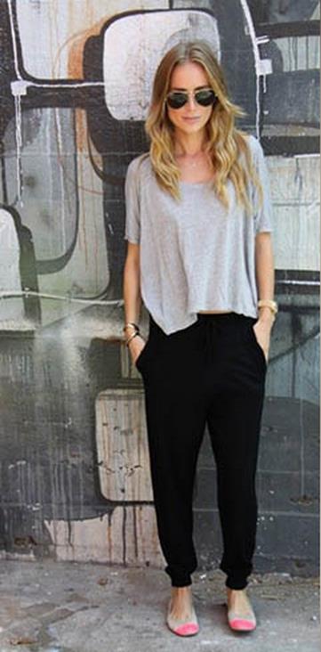 黑色哈伦裤搭配灰色衬衫,配上一双平底凉鞋十分休闲宽松、黑色哈伦裤搭配韩版T恤,再配上一双马丁靴和帽子十分摩登、同样是和T恤搭配,不同的开始不同的配饰能搭出不一样风格、不一样的feel。