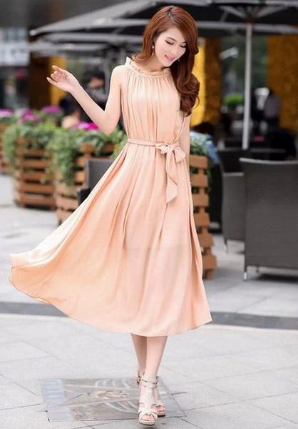 小挂脖的荷叶领长裙也许不太适合通勤,它显得太过优雅又适意,如果是参加聚会或者逛逛街倒是非常合适。纯色的百褶长裙不像普通的大摆有种可怕的气势,温柔的裸色系上腰带显露出的纤细腰肢就很动人。