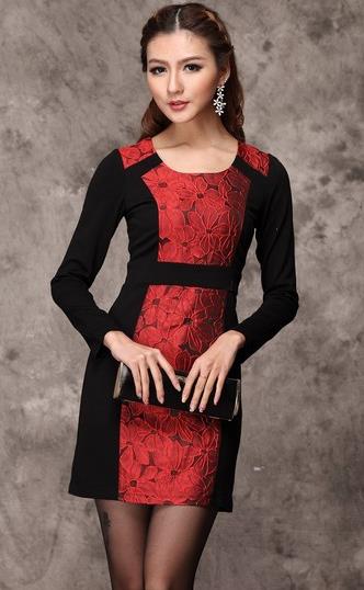 04 大气沉稳的黑红配色符合成熟女子的气质,高贵而华丽。拼接设计塑造出立体的廓形,对逐渐松弛的身材有较好的修饰作用,修身显瘦塑造出匀称的身型。精致细腻的印花拼接,复古而娇媚。