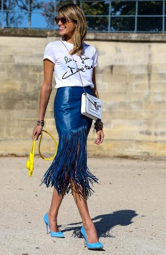 皮革窄裙的大胆设计令人眼睛为之一亮!大范围的流苏随着步伐摇摆,带出舞动的热情氛围!另外为了不抢走流苏裙襬的风采,就以宝格丽BVLGARI质感白色鍊包点缀。