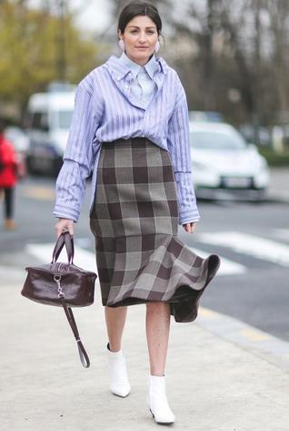 像这种衬衣叠穿搭配半身裙搭配裸靴就是今年时尚达人非常推崇的一种穿搭,既新颖又时髦,一般人也比较好驾驭。
