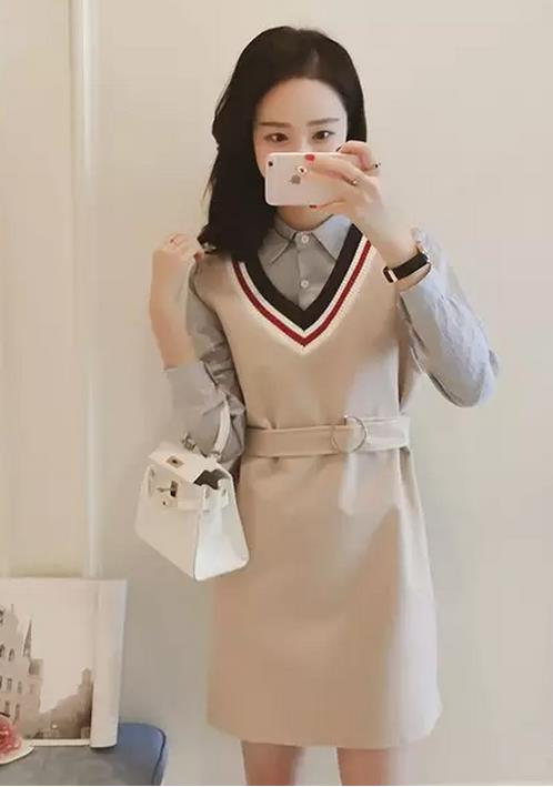 这条裙子非常的英伦风范有木有~领口撞色设计上身美的不要不要的,V领的领口增添了几分俏皮的感觉,搭配我们这期的衬衣,让你有种回到校园的feel,推荐哦~