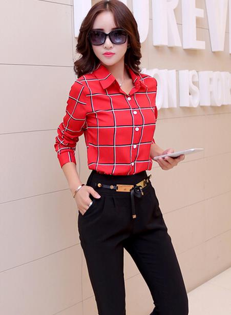 红色格子衬衫搭配上一条黑裤子,很好看简约的秋季OL职场搭配,值得尝试。