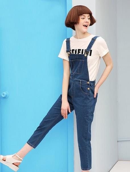 今夏流行趋势当属牛仔最热,背带裤里,也以牛仔背带裤最多,因着牛仔最个性也最百搭,街拍倍有型。裤长九分,上宽下窄设计有很好的显瘦功能,就算微胖人士也可以穿出窈窕身材来。