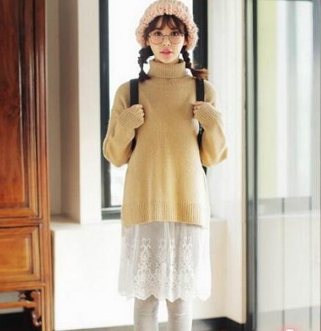 超显萝莉范的造型,还有一股复古范~高领灰色毛衫搭配半身蕾丝裙,这么层次的穿搭就是显瘦,灰色的打底裤穿上毫无违和感,配上牛津鞋更是绝配。