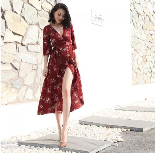 大红色加上碎花图案,给人热情如火的气氛。 V领露出若隐若现的事业线,成为吸精的焦点,不规则裙摆和开衩设计,露出一双傲人的美腿。穿上这件连衣裙,你就是性感的代名词!