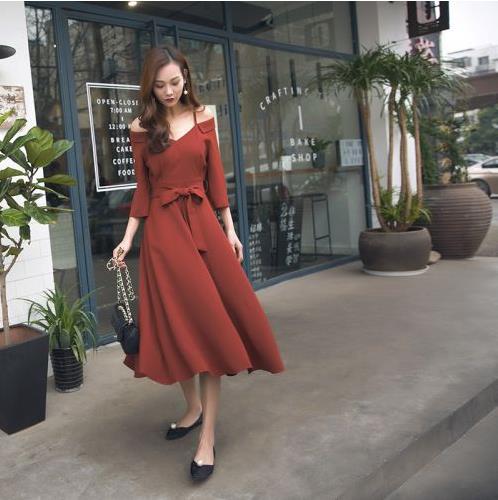 春装新款女韩版雪纺吊带长裙一字肩春款夏季连衣裙秋夏装裙子
