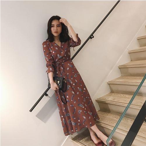 春装2017印花长袖连衣裙夏显瘦通勤碎花裙子大码雪纺春秋名媛女装