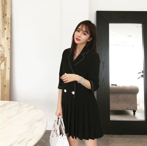 2017新款西装领宽松中袖百褶连衣裙外套 女