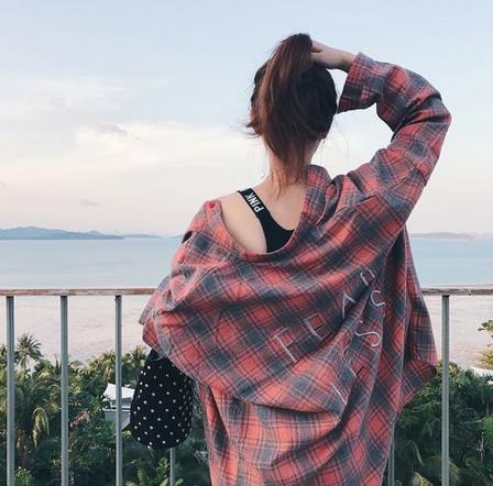 新款韩版学生中长款刺绣格子衬衫女韩范宽松长袖衬衣外套
