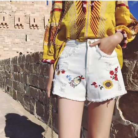 新款白色高腰热裤 刺绣宽松阔腿破洞牛仔短裤女夏