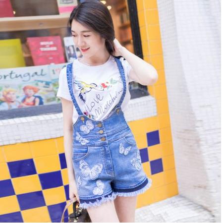 时尚蝴蝶刺绣毛边流苏显瘦高腰连体牛仔背带短裤女夏
