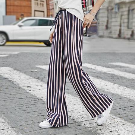 新款竖条纹阔腿裤女长裤宽松薄款松紧腰直筒裤休闲裤