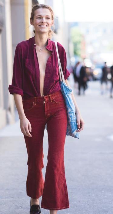 随着阔腿裤的盛行,喇叭裤的浪潮也席卷而来。如果说阔腿裤是遮短,那么喇叭裤就是修饰你的腿型,特别是及地的款式,内搭一双恨天高。显高显瘦双管齐下。