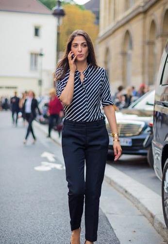 ▲条纹衬衣和黑色裤子是非常经典的搭配,若想来点新鲜感,不妨搭配一双款式特别的高跟鞋!