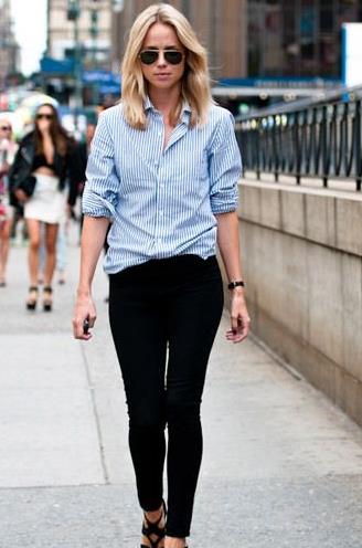【搭配示范】:条纹衬衣+黑色紧身裤+罗马高跟鞋