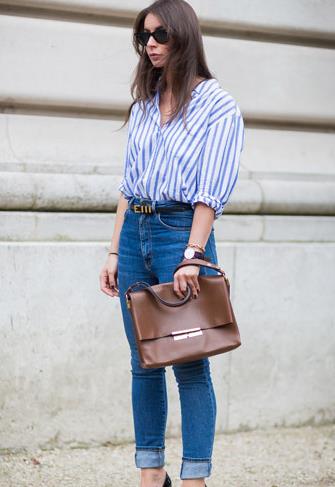 【搭配示范】:条纹衬衣+高腰紧身裤+黑色尖头高跟+皮质翻盖斜挎包