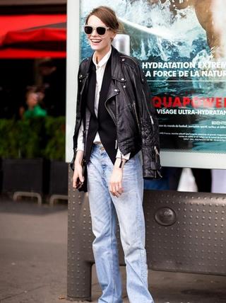 搭配要点:机车皮衣 + 黑色小西装 + 白衬衫 + 洗水牛仔裤 + 白色板鞋
