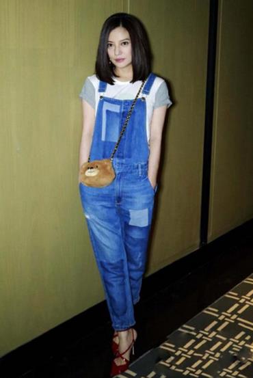 私服穿搭不妨穿条牛仔背带裤,搭配白色T恤,小熊包包更添可爱,红色尖头皮鞋却让整个装扮多了一些的女人味。