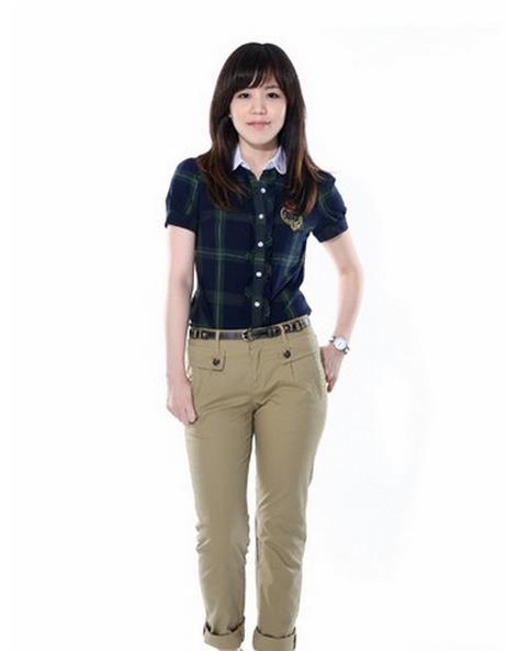 青春校园风的格纹短袖衬衫,低调沉稳的墨绿色系更反衬出一对可爱的白色小圆领,蓬蓬短袖相比长袖会更显活力俏皮一些,此外,左胸前的徽章添加更是极具减龄效果。