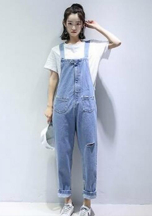 夏季胖子搭配技巧:韩版宽松显瘦破洞牛仔背带裤+白色T恤