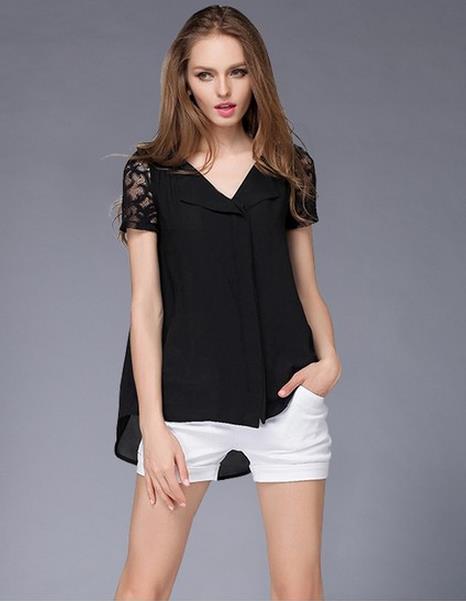 身材丰腴的MM可以利用雪纺衬衫来遮蔽身上讨厌的肉肉,还有纯黑色配合它来达到显瘦的目标,看到镂空蕾丝花朵与前短后长的不规则下摆后,你就不再嫌夏天穿黑色太沉闷了。