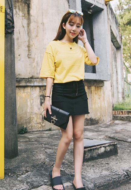 亮丽的糖果色短袖T恤,版型很宽松,穿着尽显舒适随性范,反边设计更加独特,搭配毛边牛仔半身裙,活力感立刻展现。