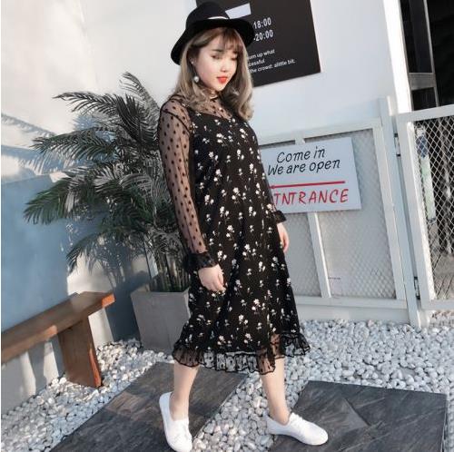 碎花裙穿出春夏文艺风,显瘦又有品位大码女装春波点蕾丝喇叭袖性感连衣裙印花中长款吊带裙肉卷大码