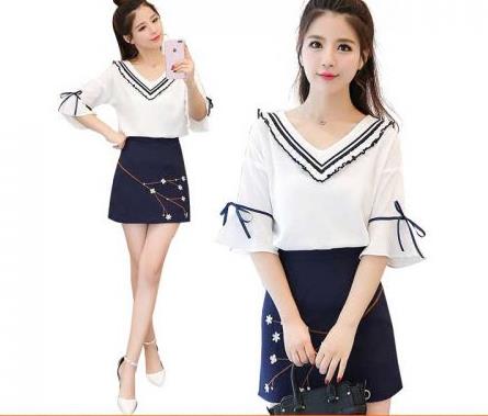 新款潮套装女韩版V领喇叭袖连衣裙 T恤 刺绣显a字裙短裙套装