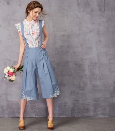种草:厚薄适中的面料,非常的挺括有型,穿着舒适凉爽。裤脚的提花清新优雅,展现小女人的特有气质。这款阔腿裤是背带设计,能够很好的修饰身形,特别是腿型不好的妹子,更合适。