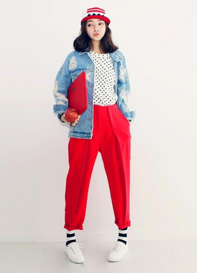 女孩子上身牛仔外套和宽松的工装裤,复古的同时还能衬托出较小的身姿,一举两得呢!