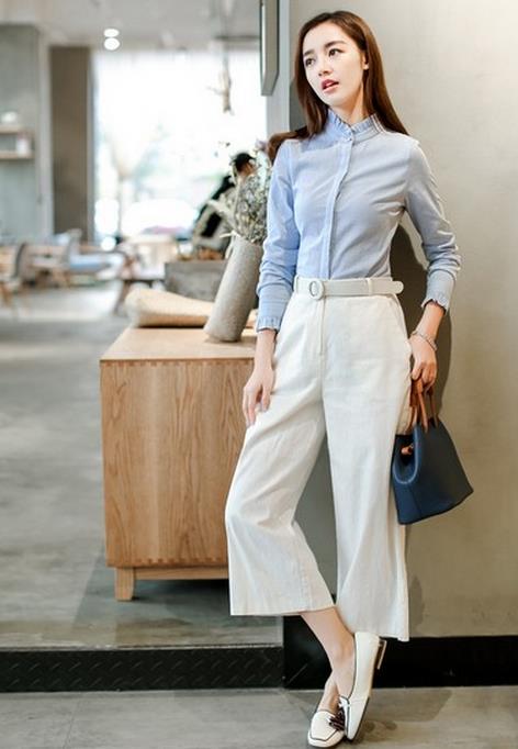 衣领和袖口褶皱花边是衬衫上的温柔点缀,带点淑女风配合柔和的面容与气质,和裤装懒人鞋等中性风单品更显刚柔平衡,色调上以无彩色为上主打清新。