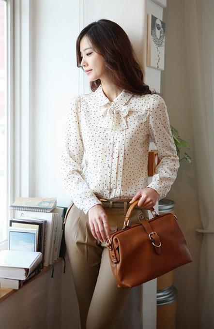 小碎花给人清新甜美感,领口上长长的系带打成精美的蝴蝶结便充满了女人味,门襟的多层褶皱彰显细节的精工细作和层次感。微灯笼袖典雅端庄,有效美化双肩的线条。搭配修身西裤,充满了知性OL气质。
