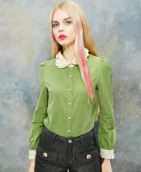 尽管我们都在一天天长大,但我们却不想因此失了那份童心。喜欢的衬衫很可爱,鲜艳的颜色洋溢青春气息,肩部的褶皱暴露内心的小顽皮,连领子也是不安分守已,像花边一样躁动着,袖口花边也与它相呼应,像精灵一般充满活力,游走在大地上点亮风景。