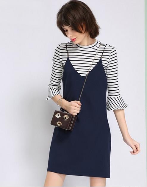 条纹衫背带裙作为无难度的组合方式,美丽无需多言,两件都是基础款皆能自由发挥随意搭配,一点喇叭袖就能让整个造型活泼起来,纤细的吊带尽显纤柔之美,线条相遇碰撞整体十分和谐。