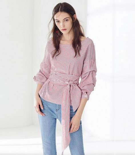 无论衣还是裙,有腰有曲线都是拥有好比例的前提,束腰在髋骨以上最瘦的位置,沙漏身形一绑搞定,个性褶皱衣袖悄悄藏肉且具强烈设计感,领口稍大可以平衡整体,彩色细条纹也是本季流行花纹的重点,亮眼而避免臃肿,用简洁的其它单品来衬托即可。