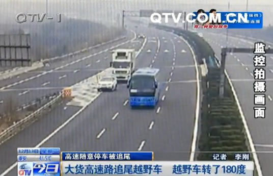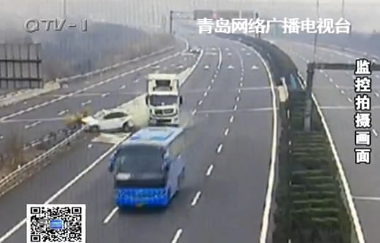 这是12月12日下午,高速公路上的监控拍下的画面。只见一辆白色越野车,在行驶到青兰高速黄岛立交桥时,突然停在了行车道上,后方一辆高速驶来的大货车措手不及,径直冲了过来,直接撞在了越野车尾部,在巨大冲击力下,越野车被推着撞上了前方的隔离墩,随后车头和车尾掉转了 180 度。