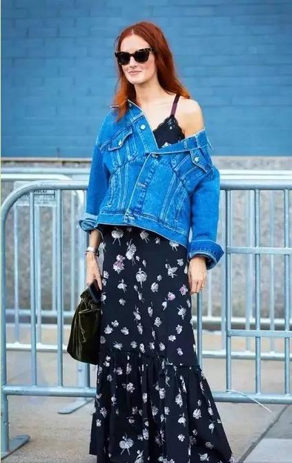 春夏季节当然不能少了印花裙的身影,长裙飘飘的感觉浪漫极了~高个子的选择长款绝对不会出错,记得牛仔外套要搭配短款的才会显得腿长噢~▼
