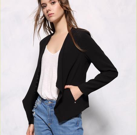 leyu嫘羽2016秋装新款通勤雪纺小西装女黑色宽松长袖无扣短外套