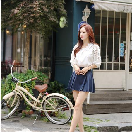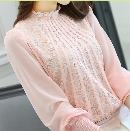 雪纺衫女长袖2017春装新款韩版大码女装百搭蕾丝上衣半高领打底衫