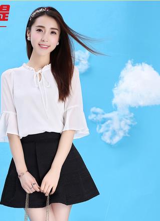 爱丽缇荷叶边喇叭袖小清新雪纺衫柔美五分短袖雪纺衬衫夏女装上衣