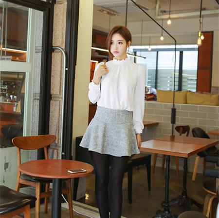 灰色A字裙尽显成熟稳重魅力,独特的皱褶彰显个性,搭配白色雪纺衫,恰到好处地修饰臀部线条。
