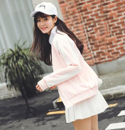 2017春季装新款甜美小清新长袖开衫女修身显瘦粉色字母棒球服外套