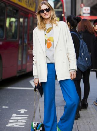 穿搭要点:米色西装+灰色卫衣+蓝色阔腿裤+拼色手袋+绿色布鞋