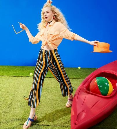 02 大胆的撞色,巧妙的线条分割,这是条纹富有变化的根本。长裤教你穿出新潮感,系带设计可收可放,遇到一件很合拍的小衫就能达到抢眼的目的。找对了款大牌感从来不迟到。